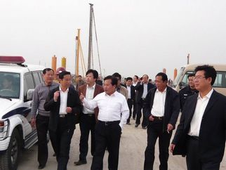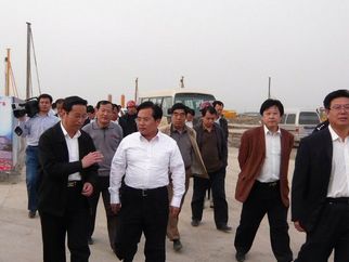 2008年4月14日,濰坊市委書記張新起視察集團公司施工中的奧體中心工程。集團公司總經理朱九洲(左上圖左三)陪同張書記視察
